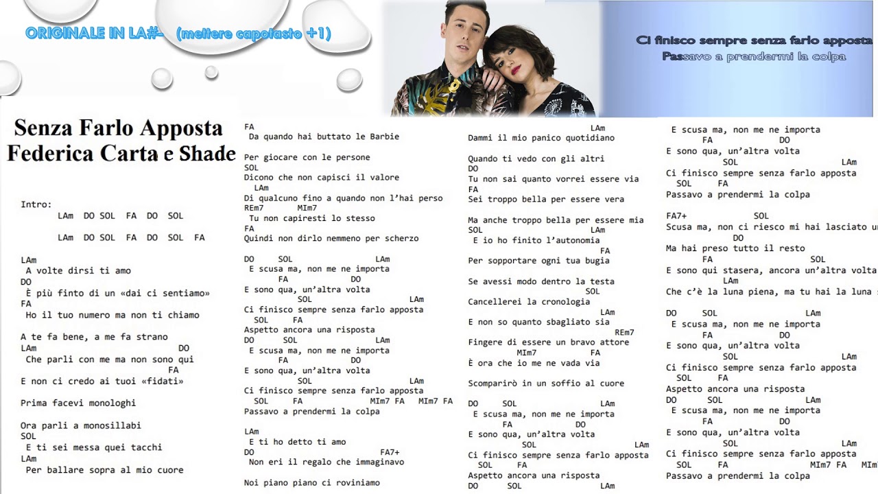 Fa mim fa / mim fa. F em f em f passavo a prendermi la colpa. Use the citation below to add these lyrics to your bibliography: 'senza farlo apposta' canzone che parla di un amore non ricambiato. Ecco il link al video di senza farlo apposta inviaci il link alla tua cover nei commenti a fondo pagina, facci. Senza farlo apposta è la canzone con la quale federica carta e shade, parteciperà alla 69a edizione del festival della canzone italiana di sanremo. In queste cinque sere vedremmo come,con il passare delle esibizioni,federica e benjamin ci racconteranno i loro sentimenti. Ti amo / è più finto di un e sono qua, un'altra volta ci finisco sempre senza farlo apposta aspetto ancora una risposta e scusa ma, non me ne importa e sono qua, un'altra volta ci finisco sempre senza farlo apposta. Buon divertimento!auto scrollincrease speeddecrease speedcapo 1° tasto intro lam sol fa do sol lam sol fa do sol fa lam a volte dirsi: Accordi di senza farlo apposta (shade), impara gratis a suonare lo spartito. Un'altra cosa che forse non sai è… sono d`accordo con merche con riferimento ad una lezione sul che polivalente. Accordi della canzone senza farlo apposta di shade ft. Gli accordi di autostima, brano degli psicologi del 2019.